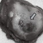 1ヵ月前から左後肢跛行を呈し、消炎鎮痛剤の内服をするも改善が認められず他院から紹介来院。左膝関節に触診上激しい疼痛を呈し、レントゲン検査上では著変は認められず。左膝関節穿刺による関節液検査では、粘稠性が低下し、塗抹上で好中球、マクロファージ、小型リンパ球を主体とした有核細胞の有意な増加が認められた。また、関節液の培養検査、リウマチ因子及び抗核抗体検査、関節切開による滑膜の病理組織検査を実施したところ、全て陰性であり、前十字靭帯の部分断裂と大腿骨遠位端の骨潰瘍を確認した。