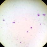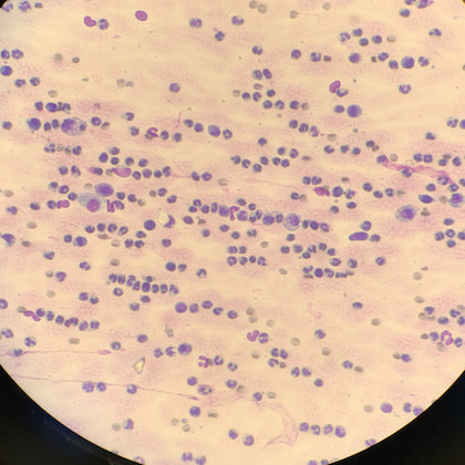 関節液検査により診断することができます。罹患動物の関節液は、正常な関節液と比較して、粘稠度の低下や顕微鏡下にて非変性性好中球の増加が認められます。