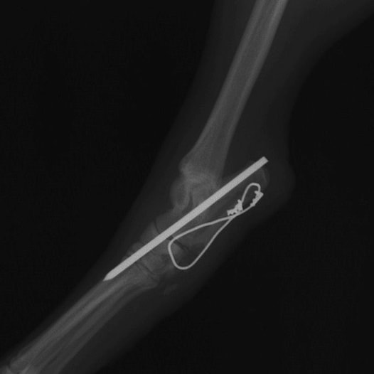 踵第4関節の関節固定術を行います。特にテンションバンドワイヤー法はどんな大きさの動物にも適用可能で、比較的簡単な方法とされています。
