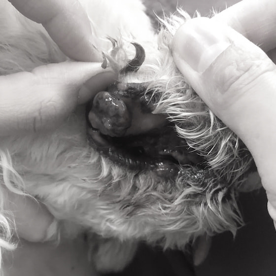 “黒色腫”は主に犬の口腔内や皮膚、指端部に認められる腫瘍で、メラニン色素を有することにより黒色の腫瘤を形成するのが特徴である(一部、色素が乏しいタイプも認められる)。皮膚に発生するものの多くは良性であるのに対し、口腔内および指端部に発生するものは悪性の挙動をとることが多いと言われている。悪性のものは、本症例のように急速な拡大傾向を示したり、潰瘍を形成することがある。