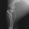 半年にわたる左後肢の跛行が認められるとのことで来院されました。触診にて左膝関節の疼痛、内側部の腫脹、膝蓋骨の内方脱臼を認めました。レントゲン検査にてfat pad signを伴う関節炎が認められたことから、前十字靭帯断裂と膝蓋骨内方脱臼( GradeⅢ)の併発と診断し、手術を行いました。術中の関節鏡検査にて前十字靭帯の完全断裂を確認、関節液検査にて感染を除外した後、TPLOと、滑車溝形成を始めとした膝蓋骨脱臼整復術を実施いたしました。