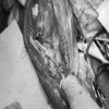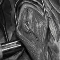 断裂前十字靭帯の除去を行いました。外側方向からのテンションが著しく、外側広筋と膝関節外側支帯の解放を行いました。膝関節伸展機構の著しいアライメント異常が認められたため、脛骨粗面転移術を実施しました。