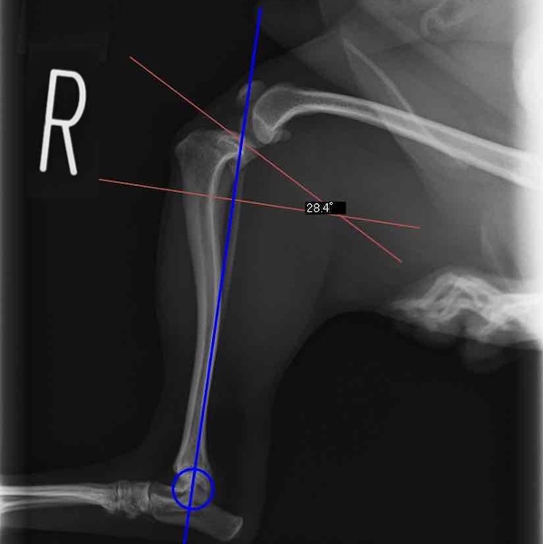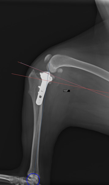 術前のTPAは左後肢33.1°右後肢26.8°でしたがTPLO実施により左後肢5.5°右後肢12°に矯正されました。