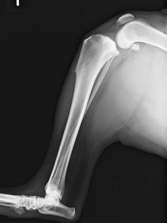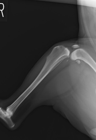 - レントゲン検査:関節周囲の様子を観察します。脛骨の前方変位、関節液の増大や関節周囲の骨棘など骨関節炎の評価を行います。