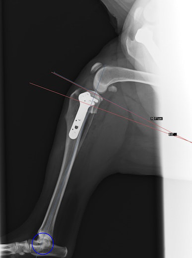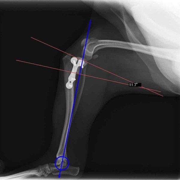 術前に25°であったTPAは、TPLO実施により7°に矯正されました。症例の歩行状態は良好です。