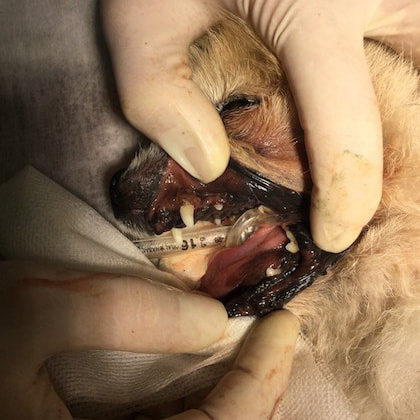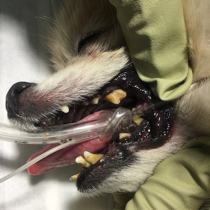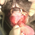 抜歯後4ヶ月間臨床症状の改善が認められましたが、炎症の持続が尾側口腔粘膜や残存している犬歯周囲に認められたため全顎抜歯(犬歯を含めた全ての歯の除去)を実施しました。全顎抜歯後2週間で顕著な炎症の消退と食欲・全身状態の改善が認められました。