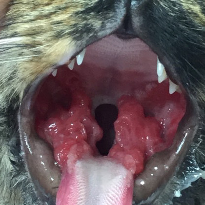 長期に及ぶな歯肉炎、口内炎および歯肉からの出血を主訴に来院されました。院内では、過剰な流涎と粘膜部位からの出血、右の口蓋舌弓粘膜に顕著な腫脹が認められました。全臼歯抜歯および、腫脹部の粘膜の切除を行いました。