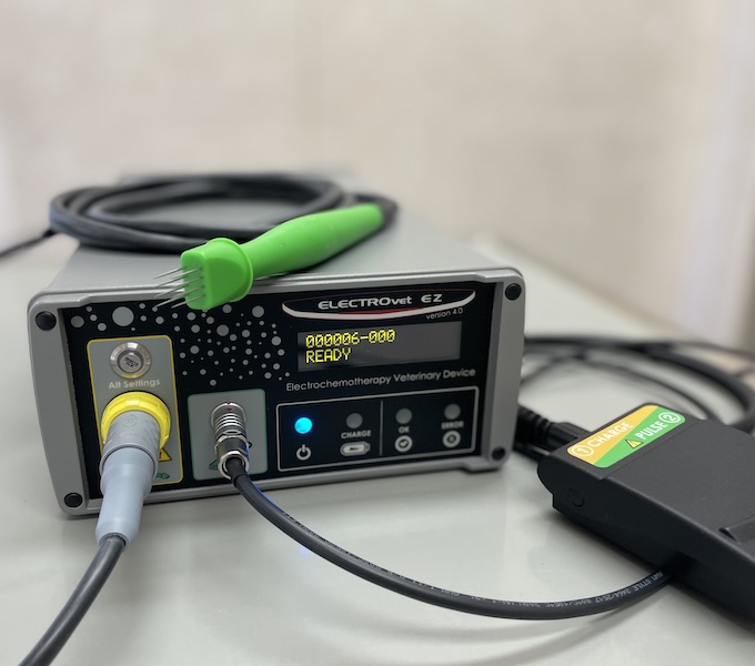 近年、犬や猫の体表の腫瘍に対する治療選択肢として電気化学療法(ECT)という治療方法が注目されています。腫瘍の縮小に効果的な薬の投与をした後、腫瘍周囲に電気パルスを与えることで、腫瘍細胞内へ薬の取り込みを高め、局所制御率の向上があることが示されています。特に肥満細胞腫や軟部組織肉腫などでの有効性が示されています。全身への副作用が比較的少なく、外科切除や放射線治療が難しい動物に適応を検討できます。腫瘍の種類や進行度によって適応が異なりますので、詳しくは当院までご相談ください。