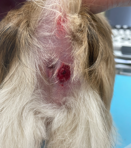 ワンちゃんやネコちゃんの肛門腺の分泌物が溜まる袋(肛門嚢)に炎症や細菌感染が生じたり、何らかの原因で出口(導管)が閉塞すると、炎症物質や膿が溜まって皮膚が破れてしまうことがあります。治療には消炎剤や抗生剤の投与が必要で、皮膚が再生するまで1〜3週間かかります。繰り返す場合は肛門嚢を取る手術が必要なこともあります。定期的な肛門腺絞りが病気の予防につながります。肛門腺絞りのみでの来院も可能ですので、お気軽にご相談ください。