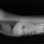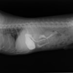 主訴:2日前の夜に桃の種を飲み込んだとのこと。元気・食欲に問題はなく、嘔吐などの消化器症状もみられなかった。誤飲した当日に他院にて催吐処置を試みたが、吐き戻さなかったとのこと。