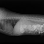 単純レントゲン検査:胃内ガス陰影・腸内ガスが少量認められる。
