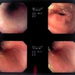 内視鏡検査:肛門付近の直腸全周に、炎症および出血を伴う結節状病変を多数認めた。