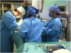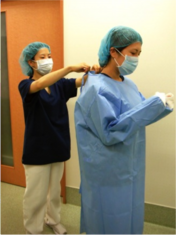 手洗い後、滅菌処理されたガウン及びグロー ブを装着し、滅菌状態で手術に臨みます。