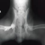 後肢の跛行を主訴に来院されました。レントゲン検査にて、左右股関節の形成不全および重度の関節炎所見を認めました。THRに関しては適応年齢(約9カ月齢以降)の範囲にありますが、左右とも長期に及ぶ骨関節炎の進行により、大腿骨頭・寛骨臼ともに重度の骨変形を伴っていました。このような症例において、THRのカップの定着が悪くTHRの手術の成功率が下がるため、機能回復の面では劣りますが、症状がより重いと判断された左後肢の大腿骨頭・骨頚切除術を実施しました。今後は、リハビリテーションを行い、患肢の機能回復に努めると共に、反対側の大腿骨頭・骨頚切除術を検討していく予定です。
