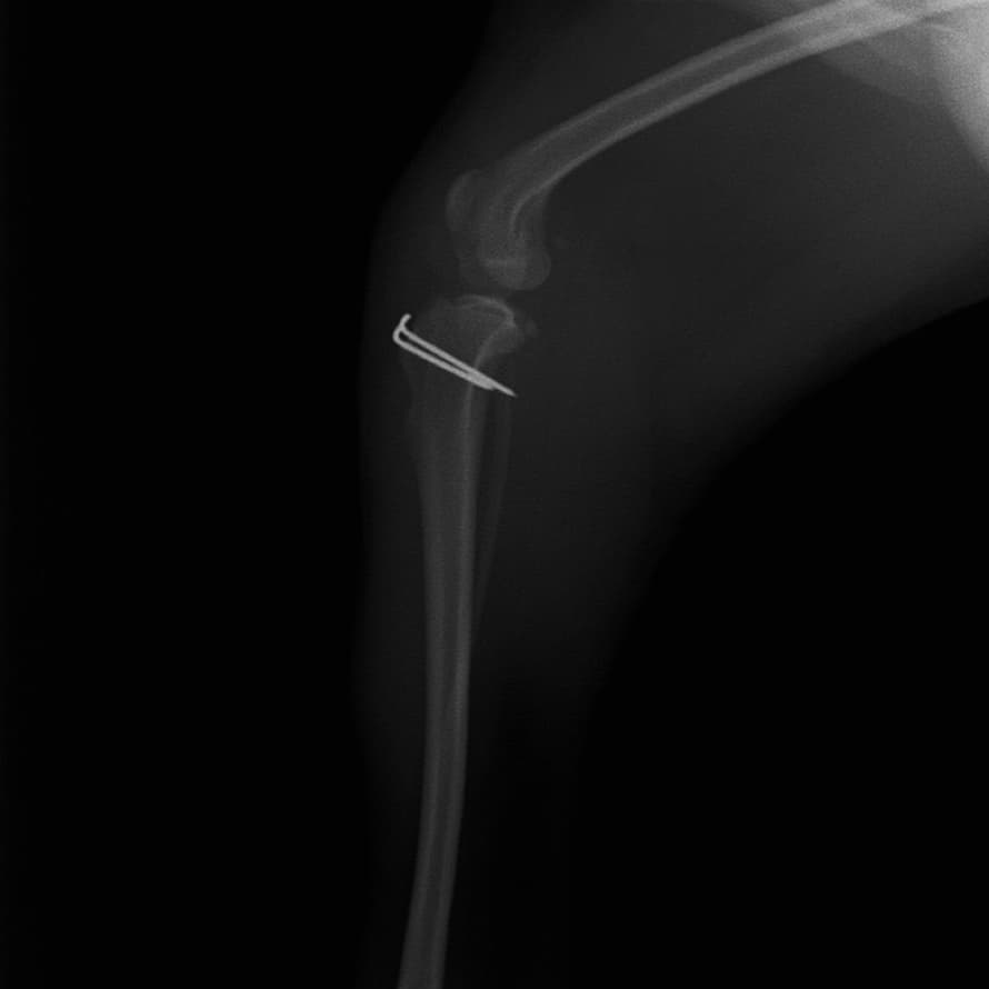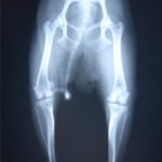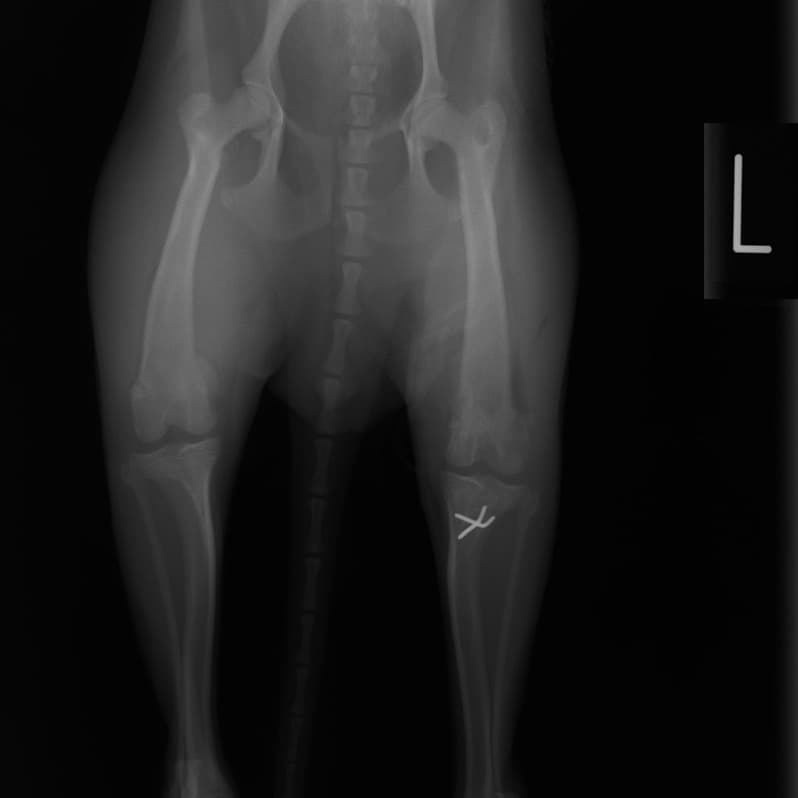 - 膝蓋骨は常に脱臼状態にあり、指で押せば整復できるがすぐに脱臼してしまいます。顕著な跛行がみられます。