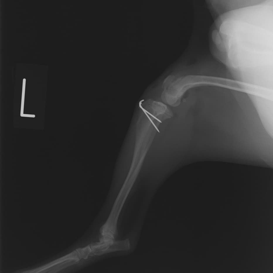 右側の膝蓋骨脱臼は上記手技で整復されたものの、左側はそれのみでは膝蓋骨が浮く様子が認められた。その為、PDS縫合糸にて膝蓋靱帯を1糸のみ縫合し、靱帯の縫縮を行った。
