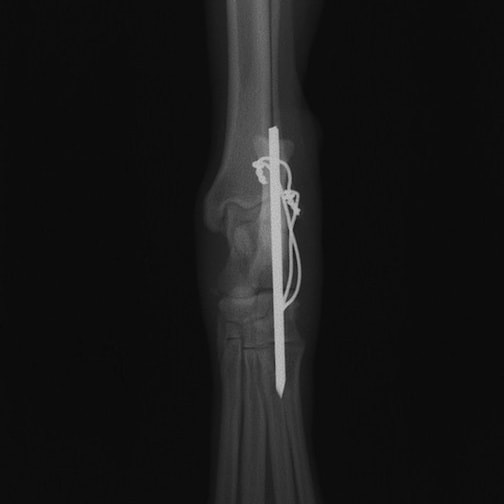 若齢動物において、橈骨と尺骨は互いに同調した成長をしています。一方の骨の成長に障害が生じると、他方の骨に変形や彎曲、関節形態の異常が引き起こされます。これらの変形が動物自身の補正可能範囲を超えてしまうと、深刻な機能異常を呈し、歩様は著しく変化します。