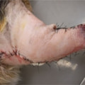 他院で処方された内服に一時的に反応はするものの悪化と良化を半年以上繰り返すとの主訴で来院。肘頭部付近に5cm大の腫瘤と皮膚炎が観察された。内服で一時良化するが腫瘤の縮小が乏 しい為、切除手術を実施し、病理組織検査にてグレード3の肥満細胞腫と診断された。皮膚肥満細胞腫は組織学的分類が重要な予後判定因子となっており、悪性度の最も高いグレード3は手術後4年生存率が6%との報告がでている(Patnaik)