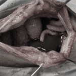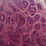 後肢の肉球からの出血を主訴に来院。肉球と皮膚との境界部に直径約5mmの傷(糜爛)を認めた。抗菌剤による治療で一時的に良化したが、その後同部位に腫瘤の形成が確認された。腫瘤が急速に増大傾向を示したため、切除手術を実施、病理組織検査にて“悪性黒色腫”と診断された。