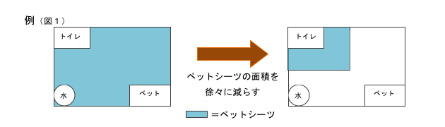 トイレトレーニングを行うにあたって最も重要な項目です。環境を整備して、成功するチャンスを作ってあげましょう。トイレを覚えるまでは、サークル内のベット以外にはペットシーツを引き、どこで排泄しても成功できるようにしましょう。ペットシーツでする事を覚えてくれたら、サークル内のペットシーツの面積を徐々に減らしましょう。ベットとトイレはできるだけ遠い位置に置いてあげる事がポイントです。(図1参照)